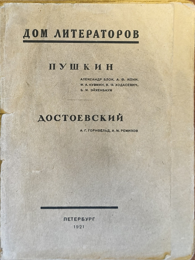 / Тираж 3000 экз. /[сб., посвящ. 84-й годовщине со дня смерти Пушкина и 40-й со дня смерти Достоевского] / Декларация о ежегодном всероссийском чествовании памяти Пушкина в день его смерти. Кузмин М. Пушкин. Блок А. О назначении поэта. Ходасевич В. Колеблемый треножник. Кони А.Ф. Общественные взгляды Пушкина. Эйхенбаум Б. Проблемы поэтики Пушкина. Горнфельд А. Два сорокалетия. Ремизов А. Огненная Россия.